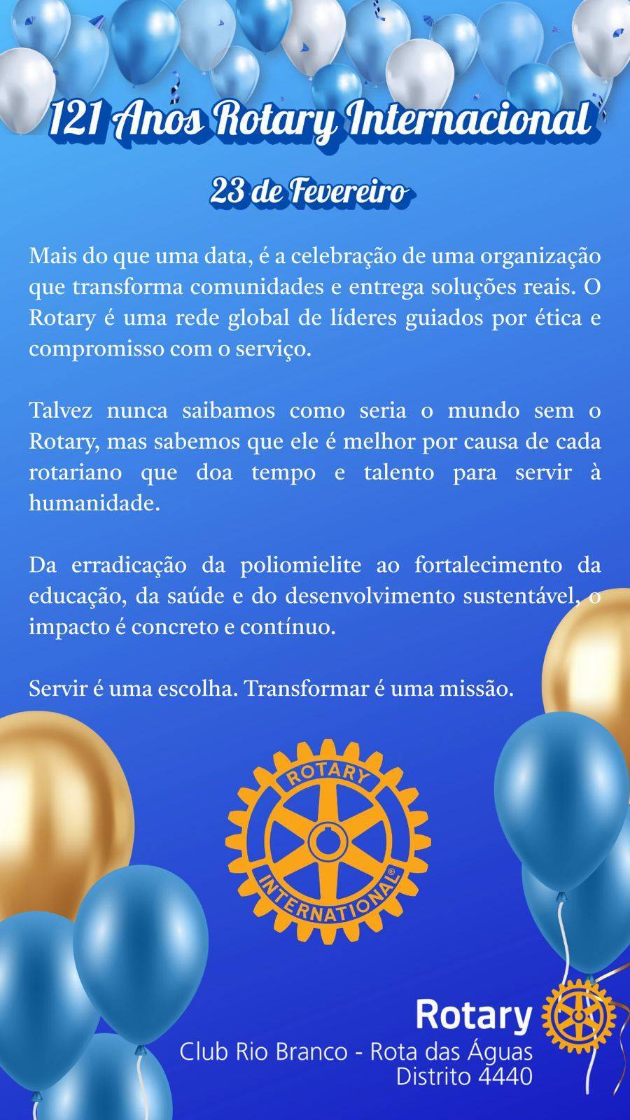 No dia 23 de fevereiro, celebra-se o Dia do Rotary, data que marca a fundação do Rotary International e simboliza mais de um século de dedicação ao serviço humanitário em todo o mundo.
