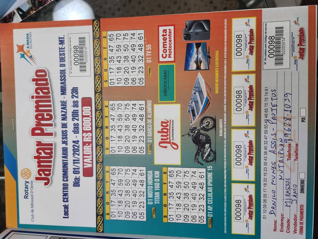 O Rotary Club de Mirassol d'oeste, distrito 4440 promoveu no dia 01/11/2024 , um sorteio de prêmios com jantar . Os prêmios foram: